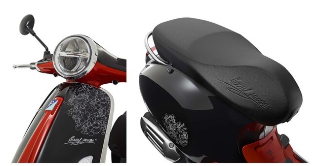 今回のコラボレーションでは、ベスパ プリマベーラ 125cc、150cc が、何十年にも渡ってウォルト・ディズニーの 最も有名なマウスを象徴してきたカラーと同じ、ブラック、レッド、ホワイトそしてイエローのカラーリングを纏いま す。イエローのホイールはミッキーマウスの靴を連想させ、ブラックのミラーは特徴的な丸い耳を彷彿させます。 車体の両サイドとフロント部分にはミッキーマウスのシルエットを描いたグラフィックが施され、さらにシートとフ ロントシェルにはミッキーマウスのサインがあしらわれています。