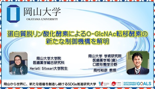 本成果は、蛋白質脱リン酸化酵素による蛋白質翻訳後修飾の新たな調節機構を解明するものであり、本学からは学術研究院医歯薬学域(岡山大学大学院医歯薬学総合研究科 口腔形態学分野)の岡村裕彦教授と同大学博士3年生のHeriati Sitosari大学院生らが参画し、科学雑誌「Biochimcal and Biophysical Research Communications」に掲載されました。