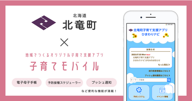 自治体向けサービスを開発する株式会社ミラボ(本社:東京都千代田区、代表取締役:谷川一也、以下「ミラボ」)の子育て支援アプリ「子育てモバイル」が、北海道 北竜町に導入され、「北竜町子育て支援アプリ ひまわりナビ」として7月3日より提供を開始しました。また、同時に乳幼児教室やイベント等のオンライン予約サービスの提供も開始しました。