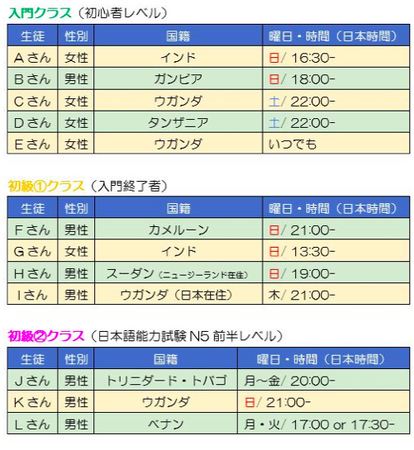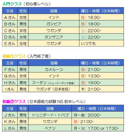 特徴5:今回、日本語を習う生徒は、インド人4人、ウガンダ人5人、ガーナ人1人、カメルーン人1人、ガンビア人1人、コロンビア人1人、ザンビア人1人、スーダン人1人、タンザニア人1人、モロッコ1人、トリニダード・トバゴ人1人、ベナン人1人、フィリピン人1人、ミャンマー人5人、14カ国からの合計25人! 生徒たちは、日本語レッスンの質を高めるためのモニターとして、授業に対するフィードバックをしてくれます。