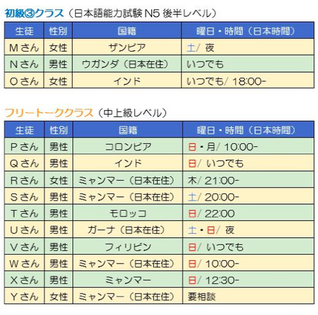特徴6:生徒のレベルは日本語を学んだことがない人から日本語能力試験(JLPT)取得者までさまざま。「入門クラス」、「初級1」から「初級3」のクラス、さらに中上級者向けの「フリートーククラス」の5つのレベルの生徒が在籍します。教える目的にあった生徒を選べます。