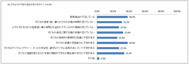 他の選択肢にも多くの回答数が集まっており、子どもと関わることのできる時間の不足、よその家庭の教育事情についての情報不足など、親はあらゆることに不安を抱いている様子がうかがえます。