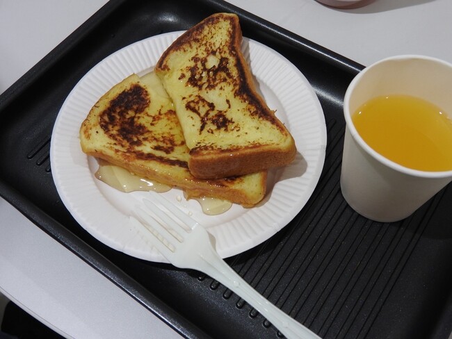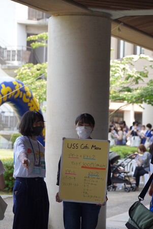 USSカフェでは、メンバーが作ったパンケーキまたは、フレンチトーストとジュースのセットを先着200個で販売しました。ご購入いただいた方からは「ふわふわでおいしかった」との好評をいただきました。また、壁にはUSSの活動写真を掲載し、USSの活動を多くの方に知っていただく良い機会となりました。