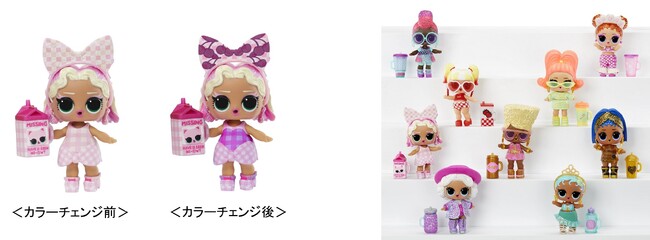 『L.O.L.サプライズ! サンシャインメイクオーバー』では、日光にあてるとカラーチェンジするという新たなサプライズを取り入れました。ドールに日光をあてるとキャラクターによってファッション、髪の毛、メイク/ボディ、いずれか1カ所がカラーチェンジし、日陰に移すと元に戻ります。どのキャラクターが出てくるかを楽しむだけでなく、手にしたドールがどのような変化をするかもお楽しみいただける商品です。『L.O.L.サプライズ!』シリーズおなじみの、ボトルから水を飲ませると「涙をながす」、「口から吹き出す」、「おもらしする」といった水を使ったギミックもいずれか一つ付いています。この商品では、全9種類のキャラクターが環境に配慮した紙製のカプセルに入っており、うち一つがランダムに出てきます。