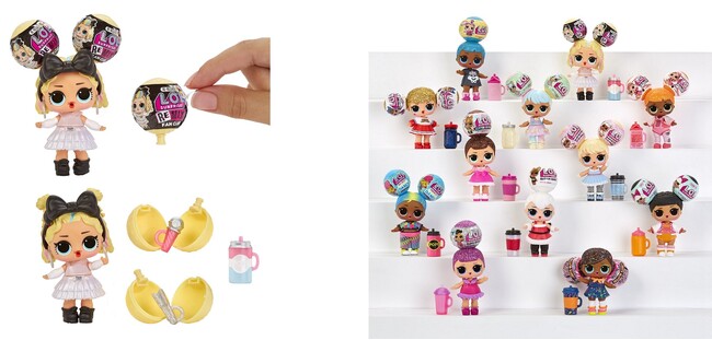 カプセルの中に入っているドールの頭に、さらにお団子ヘアのようなミニサイズのカプセルがついており、そのカプセルの中にも小さな小物が入っている、より多くの開封の楽しさと発見を味わうことができる商品です。ドールが入っていた大きいカプセルはドールスタンドとしてドールを飾っていただくことができます。『L.O.L.サプライズ!』シリーズおなじみのボトルから水を飲ませると「涙をながす」、「口から吹き出す」、「おもらしする」といった水を使ったギミックもいずれか一つ付いています。全12種類のキャラクターのうち一つがランダムに出てきます。