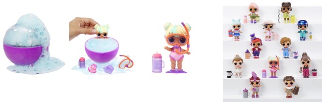 カプセル内に付属の粉末とぬるま湯を入れて混ぜるとグリッターがキラキラ光る色付きの泡が吹き出し、中からドールと洋服やボトルなどの小物が現れます。『L.O.L.サプライズ!』シリーズおなじみの、ボトルから水を飲ませると「涙をながす」、「口から吹き出す」、「おもらしする」、氷水のお風呂に入れると「カラーチェンジする」といった水を使ったギミックもいずれか一つ付いています。キャラクターは全12種類あり、うち一つがランダムに出てきます。