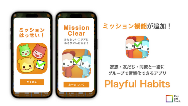 株式会社Play Life Studio(代表取締役 清水啓太郎)は2023年7月5日(水)、ゲーミフィケーション技術を用いた習慣化アプリ"Playful Habits"に"ミッション機能"を導入し、アプリ内で新しいエリアに遊びに行けるようになったversion1.1.0をリリースしました。