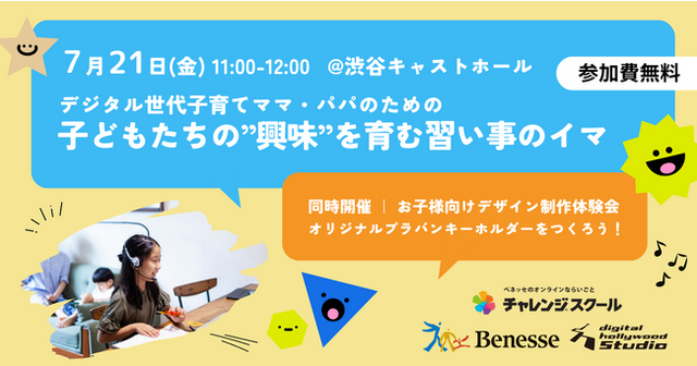上記でご紹介したセミナー開催と同じ時間帯に、お子様向けのイベントとしてベネッセのオンライン習い事「チャレンジスクール」デジタルクリエイターコースの夏休みリアル体験会を開催します。
