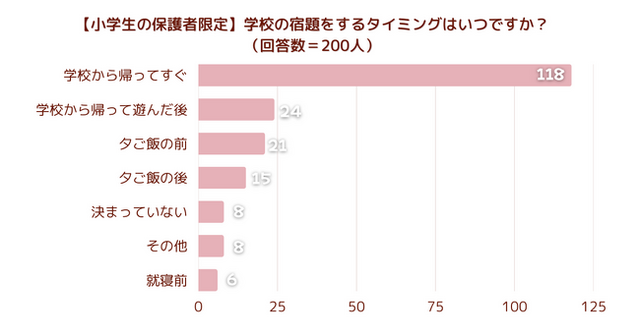 「【小学生の保護者限定】学校の宿題をするタイミングはいつですか?」とアンケート調査した結果、1位は『学校から帰ってすぐ』でした。