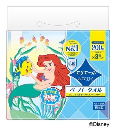 お手ふきから洗面まわりのふき掃除など、家庭内のさまざまなシーンで手軽に使用できる『Plus+(プラス)キレイ ペーパータオル コンパクトタイプ』は、『リトル・マーメイド』に登場する“アリエル”などのキャラクターが描かれ、水まわりになじむブルーが印象的な3種のパッケージデザインに仕上げました。