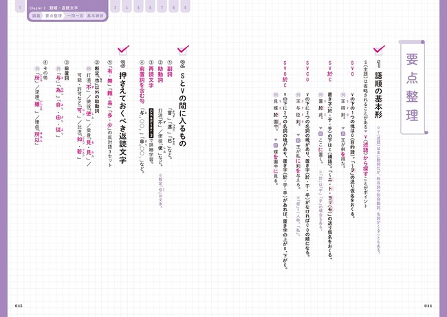 本書は、「高校3年分の漢文句法を最速で駆け抜ける本」を基本コンセプトに、漢文句法のエッセンスを9つのチャプターに凝縮しました。
