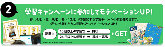 毎年4月・8月・12月に、『1ヶ月の間に何日「天神」で学習できるか』にチャレンジする「学習キャンペーン」を開催しています。対象の1ヶ月間に10日以上「天神」で学習したら賞状が、24日以上「天神」で学習したらタオオリジナルグッズがもらえます。
