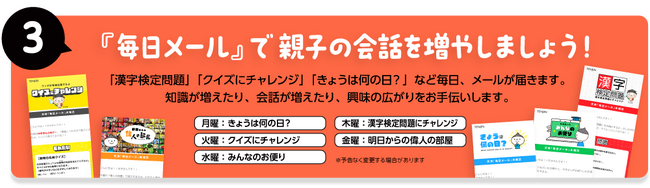 「毎日メール」とは、毎週平日(月~金)に届く、毎日の学習に楽しみをもう一つプラスするコンテンツです。
