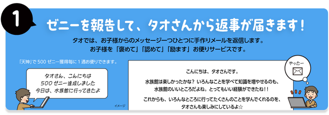 「こんなことをがんばったよ!」といったお子様からのメッセージに、タオさんから一通一通、がんばりへの称賛とともに、お子様への応援や励ましのメールをお送りします。 AIではなく、タオ社員が真心をこめてお便りします。