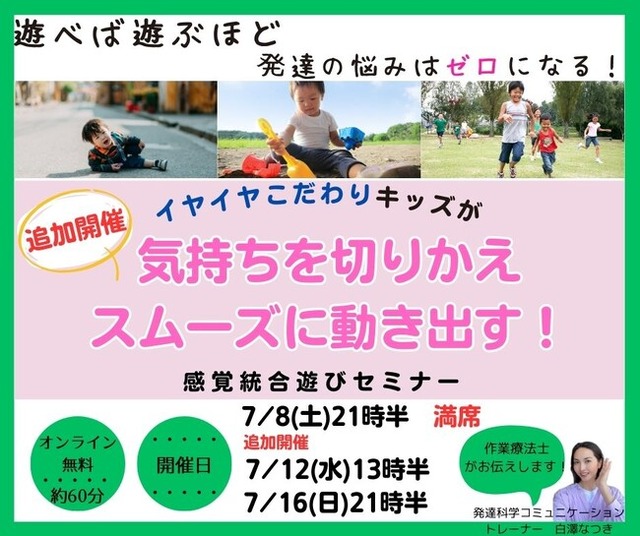 この度、『╲イヤイヤこだわりキッズ専用/遊べば遊ぶほど発達の悩みはゼロになる!自分で気持ちを切り替え、スムーズに動き出す!ママの声かけ×感覚統合あそびセミナー』を開催いたします。