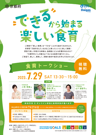 京都府では、京都の食材や食文化を取り入れた家庭での食育について提案する「食育トークショー」を7月29日に京都リサーチパークにて開催します。(YouTubeによる同時配信を実施)
