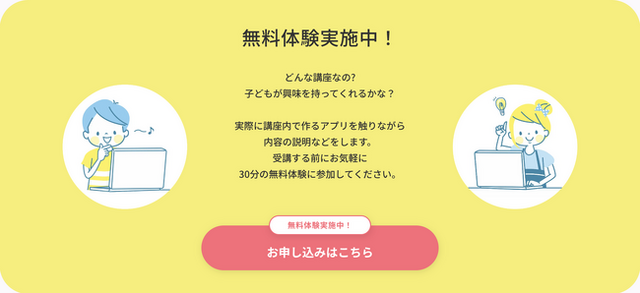 初回お申し込み2時間分無料キャンペーン実施中! 7月中にお申し込みいただいた方は初回の2時間分の受講が無料になります。子供と一緒にプログラミングを学びたいお父さん、忙しい日々でコミュニケーションに悩んでいるご家庭にぜひおすすめです。