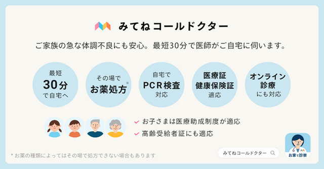 「みてねコールドクター」は、最短30分で自宅に医師を呼ぶことができる、健康保険が適用可能な夜間・休日の往診アプリ※1です。アプリから簡単に依頼でき、医師がご自宅に伺い診察※2、その場でお薬をお渡しします※3。また、「夜間・休日に限らず相談したい」というご要望にお応えして、24時間365日対応※4のオンライン診療や医療相談も提供しています。医療相談は無料でご利用いただけ、相談後に往診やオンライン診療をご依頼いただくことも可能です。あらかじめアプリをインストールし、ご自身やご家族の情報を登録しておくと、急な体調不良時も慌てず安心。経験豊富な約400名の医師が、あなたとご家族の健康をいつでもサポートします。
