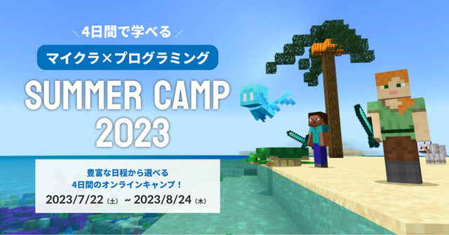 「SUMMER CAMP 2023」は、2023年の夏休み期間中、小学生を対象に4日間のオンラインキャンプを開催します。教育版マインクラフトを使いながら、プログラミングスキルを身につけ、冒険の世界を探検しましょう!