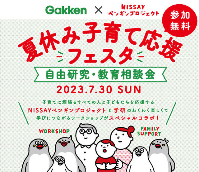 株式会社 学研ホールディングス(東京都・品川区/代表取締役社長:宮原 博昭、以下当社)は、日本生命保険相互相互会社(大阪府・大阪市・中央区/代表取締役社長:清水 博)による「NISSAYペンギンプロジェクト」とのコラボレーションイベント「夏休み子育て応援フェスタ」を2023年7月30日に開催いたします。