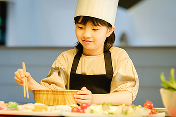 約50種類のメニューから好きなおかずを選びながら、栄養や彩りなどお弁当作りのポイントを学ぶことができる。ほかにも「かまぼこ職人」や「カメラマン」など様々な仕事体験が可能。終了後にはジェラートやかまぼこと交換できる「かまぼこ給」がもらえるのも嬉しい。