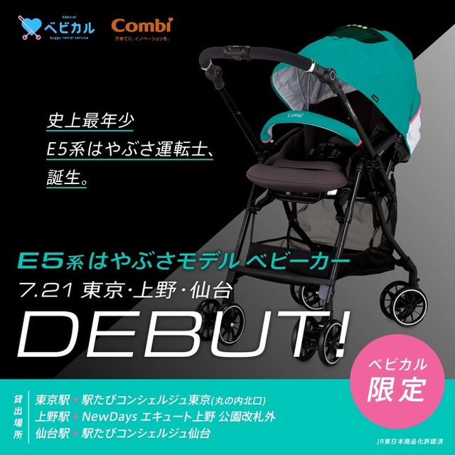 ◆この度、コンビ株式会社と連携し、小さなお子さまに人気の東北新幹線「E5系はやぶさ」をデザインしたオリジナルベビーカーを共同で開発・製作いたしました。東京駅・上野駅・仙台駅のベビカルステーションにて7月21日より利用を開始するとともに、10月31日までの期間限定でご利用いただいた方を対象にプレゼントキャンペーンを開催いたします。
