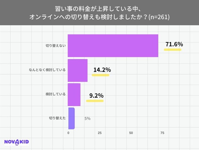 「習い事の料金が上昇している中、オンラインへの切り替えも検討しましたか?」(n=261)という質問に対し、「切り替えない」が71.6%で最も多く、次いで「なんとなく検討している」が14.2%という結果になりました。「検討している」「切り替えた」も含めると、全体の3割がオンラインへの切り替えを検討していることになります。スイミングなど物理的に切り替えられない習い事が多い中、塾や英会話などは手頃なオンラインのサービスが増えたことで検討している人も多いようです。