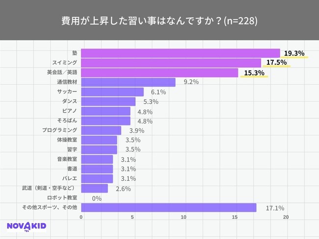 「費用が上昇した習い事はなんですか?」(n=228)という質問に対して、「塾」が最も多く19.3%、次いで「スイミング」が17.5%、「英語/英会話」が15.3%という結果になりました。塾やスイミングは習っている対象者が多いということもありますが、教材費や人件費、光熱費などの施設費が物価高騰の影響を受けていると考えられます。