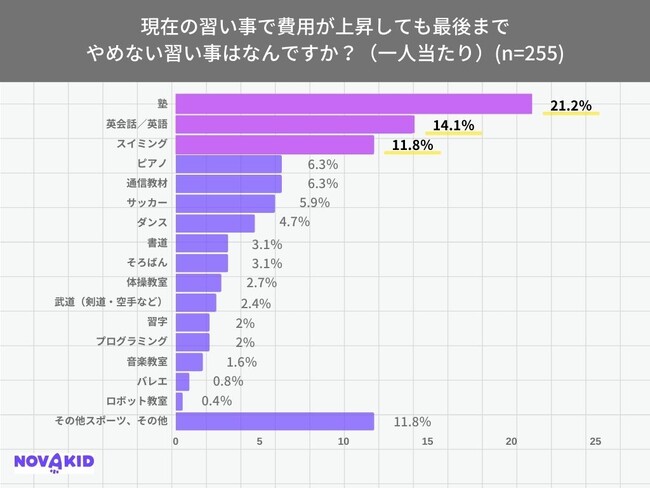 「現在の習い事で費用が上昇しても最後までやめない習い事はなんですか?(一人当たり)」(n=255)という質問に対して、「塾」が最も多く21.2%、次いで「英語/英会話」が14.1%、「スイミング」が11.8%という結果になりました。