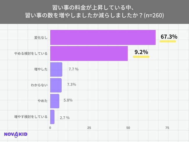 「習い事の料金が上昇している中、習い事の数を増やしましたか減らしましたか?」(n=260)という質問に対し、67.3%が「変化なし」、次いで「やめる検討をしている」が9.2%という結果になりました。「やめた」という回答も5.8%あり、値上げに伴い習い事を既に減らしたという人もいるようです。