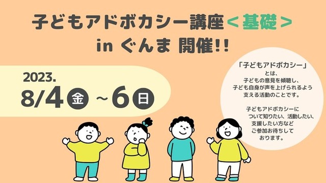 NPO法人全国子どもアドボカシー協議会(所在地:福岡県福岡市中央区、理事長:相澤 仁)は、任意団体「子どもアドボカシーセンター☆ぐんま☆」(代表:豊島 美和)と共催で、8/4(金)より群馬県内で初めて「子どもアドボカシー講座<基礎>」を開講いたします。