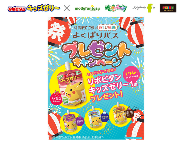 株式会社イオンファンタジー(本社:千葉県千葉市、代表取締役社長:藤原徳也、以下、当社)は、7月14日(金)より、当社のアミューズメント施設「モーリーファンタジー」「PALO」等で利用できる時間内定額でゲームがあそび放題になる「よくばりパス」をご利用のお客さまに、「よくばりパス」1枚ご利用につき「リポビタンキッズゼリー」が無料でもらえるプレゼントキャンペーンを開催します。