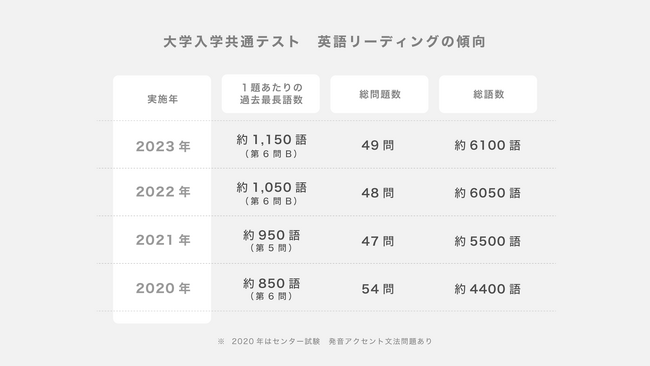 新課程の試作問題が発表され、その中で英語リーディングはA問題とB問題の2つが公表されました。注目すべきことは、共通テストでは「ライティング」が測れないためか、ABともにライティングを意識した内容となっていたこと、A問題の語彙数が約1300語あったことです。共通テスト英語リーディング1題の最長語数が昨年の約1150語でしたが、それを大きく超えていました。共通テストになり、総語数は年々上昇し、2年連続6000語を超えています。80分の試験で、マークや見直しで5分と考えて、150wpm(word per minute:1分間に読める語数)で読む時間が40分、考える時間35分、120wpmだと読む時間は50分、考える時間25分になります。このように総語数が年々増えて、速く英文を読み取る必要性がましています。英語以外の科目でも過去のセンター試験、共通テスト、今回の試作問題を比較してみると、知識を詰め込んで点数が取れるテストから、分量が増え、思考問題や読み取り問題が増えていることがわかります。勉強量がより必要になっていることや、親世代の時代の入試とは大きく異なることを理解し、子どもをより早く戦略的な受験対策開始へと導くことが必要です。