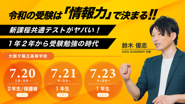 大学受験の常識を変えるアクシビジョン株式会社 (本社:愛知県田原市、本部:東京都文京区、代表取締役:鈴木 優志)が運営する「AXIV for school」は大阪夕陽丘学園高等学校(大阪府大阪市天王寺区)で在校生の1、2年生と保護者を対象に、2025年から始まる新課程入試の最新情報や試作問題からみた変更点、入試の多様化による「情報力」の重要性など「令和の受験必勝法」を代表鈴木が7月20日から講演します。