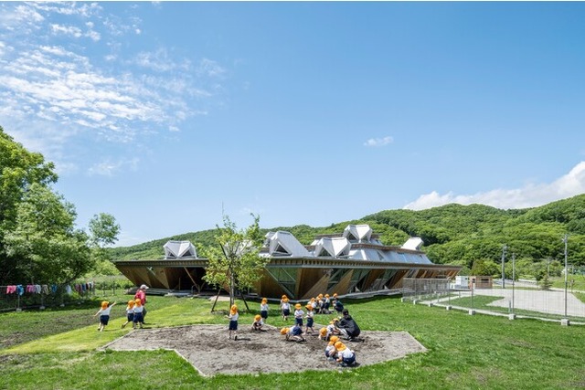 「浦河フレンド森のようちえん」は、その名のとおり、自然体験を通じての学びを重視しています。園舎に隣接する8ヘクタールに及ぶ「かしわの森」はもちろん、木材がふんだんに使われた園舎(2022年度「北海道赤レンガ建築賞」受賞)も自然的。森で出会う植物や生き物を題材にどう遊ぶか、園舎の建物自体を遊具にして柱や梁によじ登ったりするのも自由。子どもたち主体の学びを促しており、だんだんと「遊びの達人」へ成長していきます。