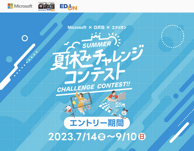 全国にロボットプログラミング教室を展開するエディオングループの「ロボ団」が、「日本マイクロソフト」の協力のもと、全国の子どもたちを対象に開催するコンテストです。本チャレンジは、子どもたちの新たな挑戦の機会として、昨年度から実施しているロボ団生徒向けの動画制作チャレンジに加え、本年度は全国の子どもたちが参加できるタイピングチャレンジをコンテスト形式で同時開催します。