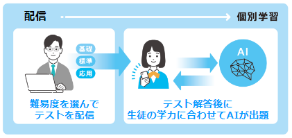 「課題配信機能」に搭載しているテストは、履修内容をフォローする単元粒度と分量になっており、AIのサポートによる個別最適な学習体験によって、生徒は自信を持って次の単元に進むことが可能となります。