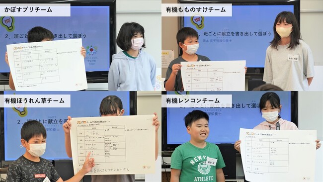 授業の最後には、各チームで決定したメニューを発表。なぜこのメニューをつくったのかという理由や、メニューのこだわり等を説明いたしました。今後、今回決定したメニューの試作を9月・10月の2回にわたって調理実習を行い、11月の発表会に向けてメニューの調整をしてまいります。