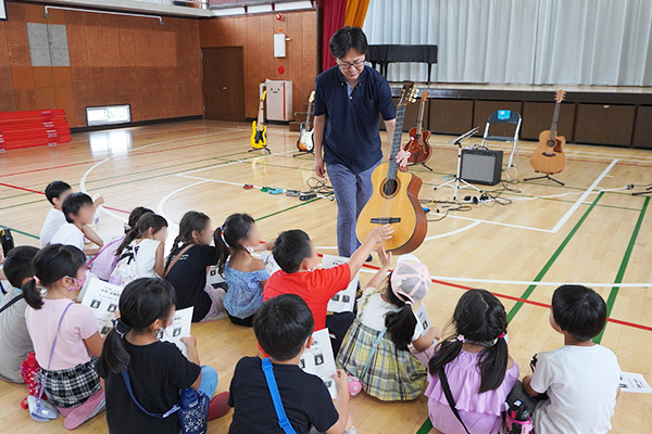 アコースティックギターの優しい音色に聴き入る子や、エレキギター の大きな音にビックリして耳を塞ぐ子など、目の前で演奏されるギタ ーの音を楽しんでいました。