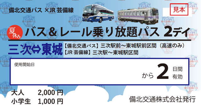 〇名 称 夏休みバス&レール どっちも乗り放題パス2デイ 三次⇔東城