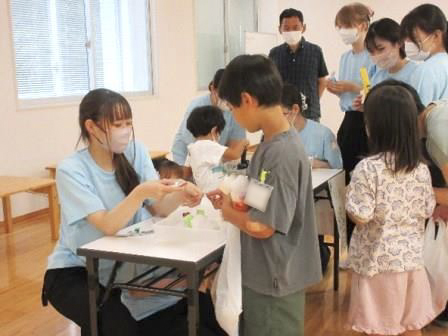 グラウンド、中庭、校舎前に隠された宝物をみんなで探しました。宝物はミニ消しゴム、シール、スーパーボール、ビーズで作ったアクセサリーなどが入ったガチャガチャカプセルで、学生の手作り。子どもたちは宝物を見つけて「あったよ!」と元気にはしゃいでいました。