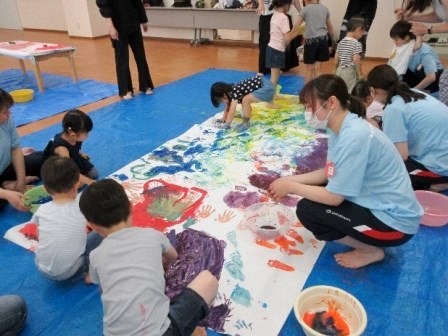 床の上に大きな紙を敷いて、身体に大胆に絵の具をつけて遊ぶ「大コーナー」と、机の上に紙を置いて筆やスポンジで色を塗ったり絵を描いたりする「小コーナー」の2種類を用意しました。はじめは『やりたくない』と戸惑っていた子どもたちも、最後にはすっかりこの遊びに取りつかれていました。