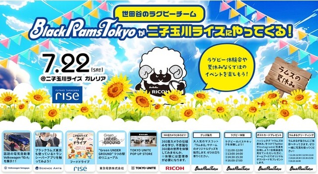 今回は「ラムズの夏休み」をテーマに、パートナー様ご協力のもと、お子さまの夏休みの学びのヒントになるブース出展をおこないます。ブラックラムズ東京と一緒に、夏休みの1日を楽しみましょう!ぜひ皆様で二子玉川ライズ ガレリアへお越しください。