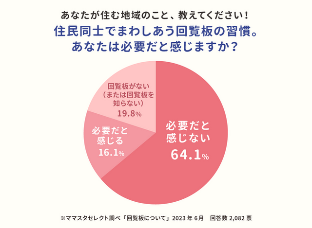 町内会などで必要なお知らせを、順にまわして閲覧する「回覧板」。近所付き合いが希薄になりつつある現代、回覧板を使って近隣と連絡を取る地域も少なくなってきているのかもしれません。そこでママスタセレクトでは「回覧板の習慣、あなたは必要だと感じますか?」というアンケートを実施。「必要だと感じる」「必要だと感じない」「回覧板がない(または回覧板を知らない)」の選択肢を設定したところ、2,000人を超える回答が寄せられました。