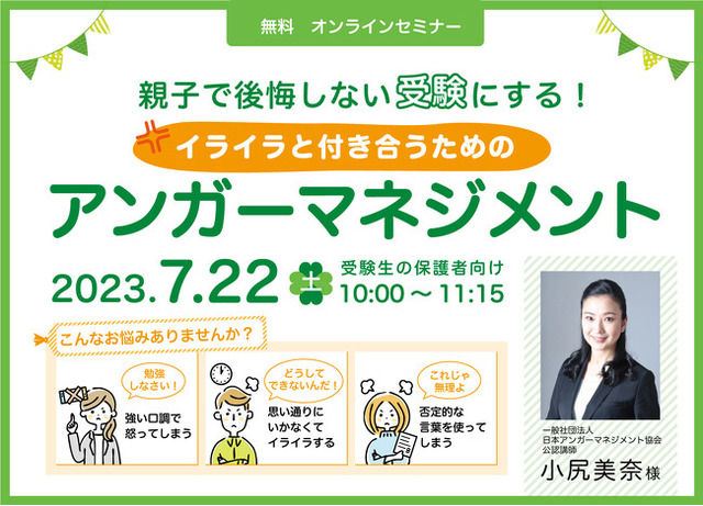 ICT教材の企画開発・販売を行なう株式会社SRJ(本社:東京都中央区、代表:堀川直人、以下「SRJ」)は、2023年7月22日、受験生のお子さまがいらっしゃる保護者の方を対象に、無料オンラインセミナー『親子で後悔しない受験にする!イライラと付き合うためのアンガーマネジメント』を開催いたします。