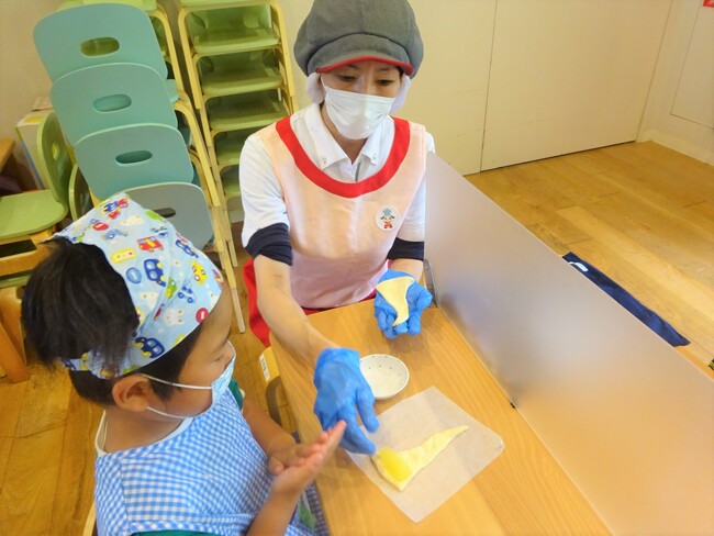 間食は、幼児にとって必要なエネルギーや栄養を補うために大切な食事の1つと捉えており、そこに体験を取り入れることで、より価値のある機会にしていきます。また、トッピングにはチョコではなくアレルギーも考慮した食材を選定し、すべての子供たちに楽しんでもらえるように対応します。