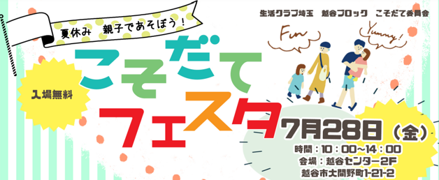 生活クラブ生活協同組合埼玉(本部:埼玉県川口市、以下生活クラブ埼玉)は、町おこしや地域交流の一環として地域の出店者を募り、親子で参加できるこそだてイベント「夏休み 親子であそぼう!こそだてフェスタ」を2023年7月28日(金)に、生活クラブ越谷センターにて開催します。