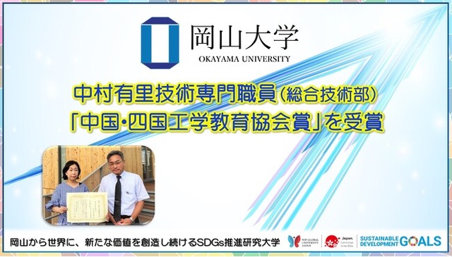 国立大学法人岡山大学(本部:岡山市北区、学長:那須保友)総合技術部教育支援技術課の中村有里技術専門職員が2023年7月4日、これまで工学部で実施してきた「工学分野における持続可能な国際連携セミナーへの取り組み」が評価され、「中国・四国工学教育協会賞」を受賞しました。