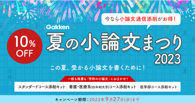その中の一つとして、添削指導による入試小論文対策の「学研小論文個別指導講座」では、各講座を特別価格にてご提供する「夏の小論文まつり」キャンペーンを開催。2023年9月27日(水)までの期間限定で、当講座の全3コースを10%OFFの特別割引価格にてご提供いたします。