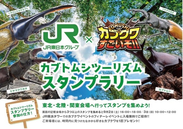 〇カブトムシツーリズムと称してJR東日本管内で実施する「TOMUSHIのカブクワすごいぞ!」対象会場にてスタンプラリーを実施します。対象の6か所の会場の内、3か所のスタンプを集められた方にはJR横浜タワーで行うフィナーレイベントにご招待、展示中の珍しいカブトムシ・クワガタを1匹プレゼントいたします。